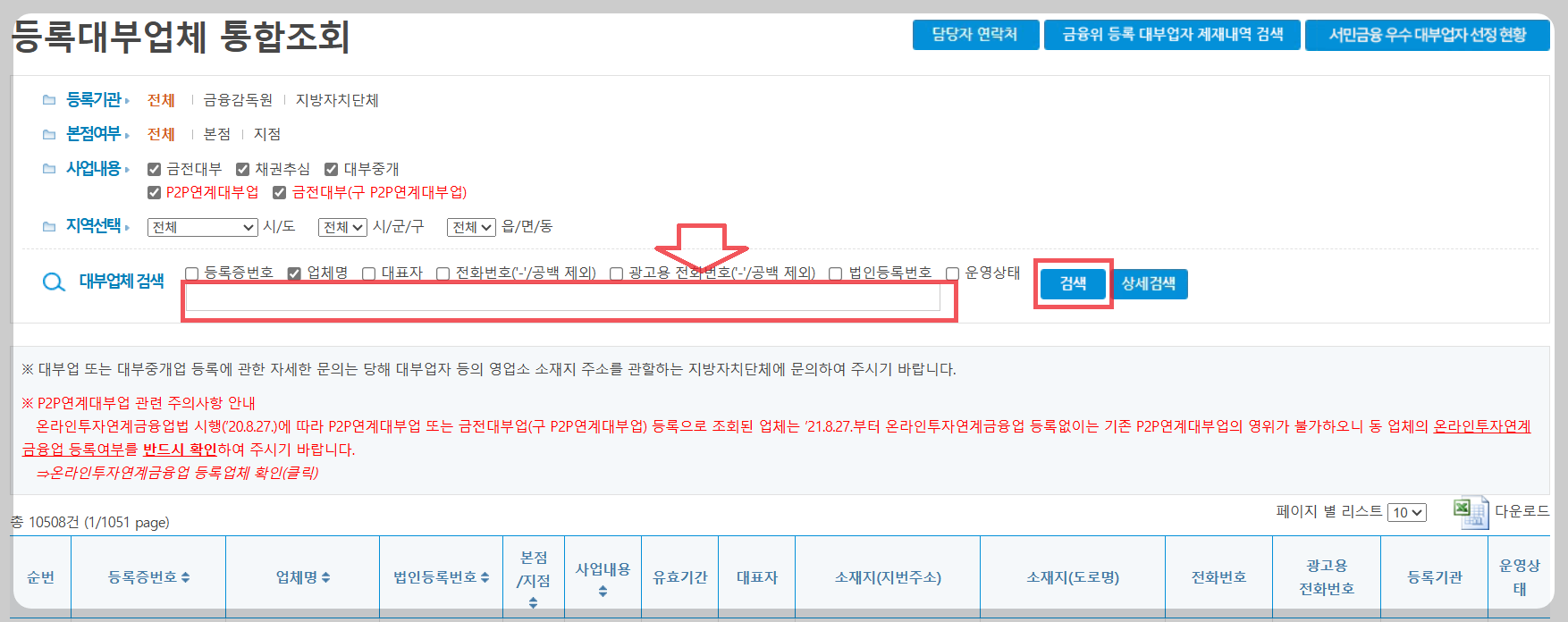 (5) '대부업체 검색'란에 업체명을 넣고 검색아이콘을 클릭하면 하단에 업체에 대한 정보가 보입니다. 조회되지 않는 업체라면 불법업체이니 거래하지 마시길 바랍니다.